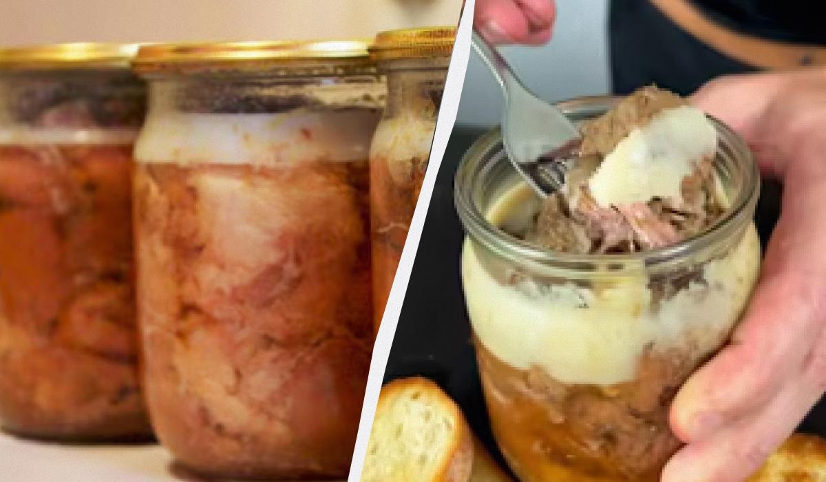 Med kuhanjem mesa nikoli ne mešajte z žlico. Po dveh urah odprite pokrov in pritisnite na meso, da se maščoba dvigne in je nad ravnijo mesa. Pokrov ponovno pokrijte in kuhajte še eno uro, nato dodajte lovorjev list. Ponovno pokrijte pokrov in kuhajte uro in pol do dve uri. Preverite, ali kosi svinjine ob pritiskanju razpadajo. Če se pritisnejo, je enolončnica pripravljena. Lahko jo naložite v sterilizirane kozarce in shranite.